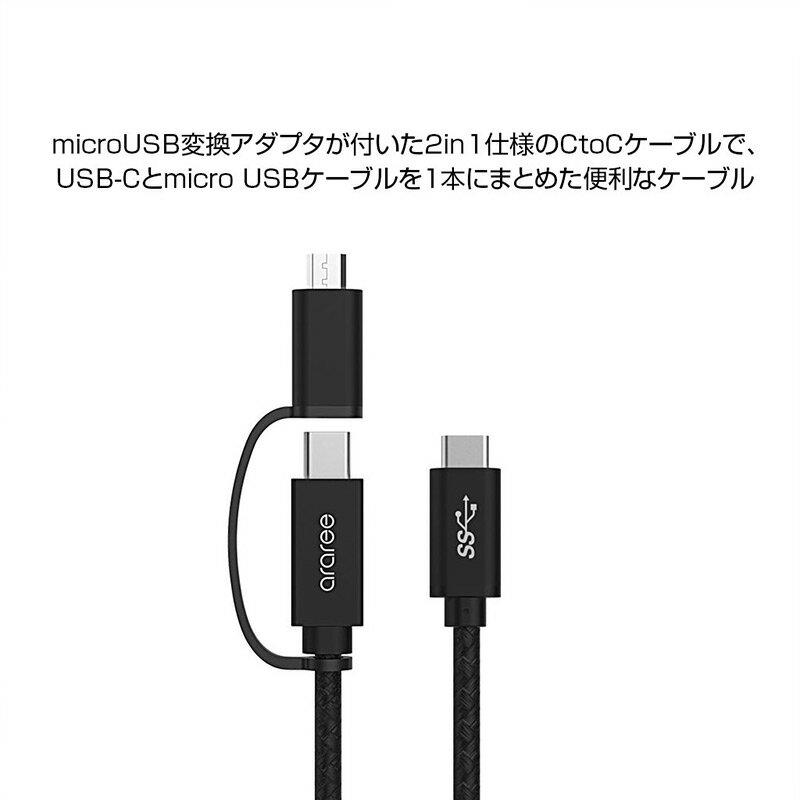■2in1デザインUSB-C端子に接続可能なmicro USB変換アダプタがついた便利な2in1ケーブルです。