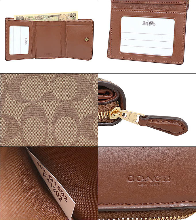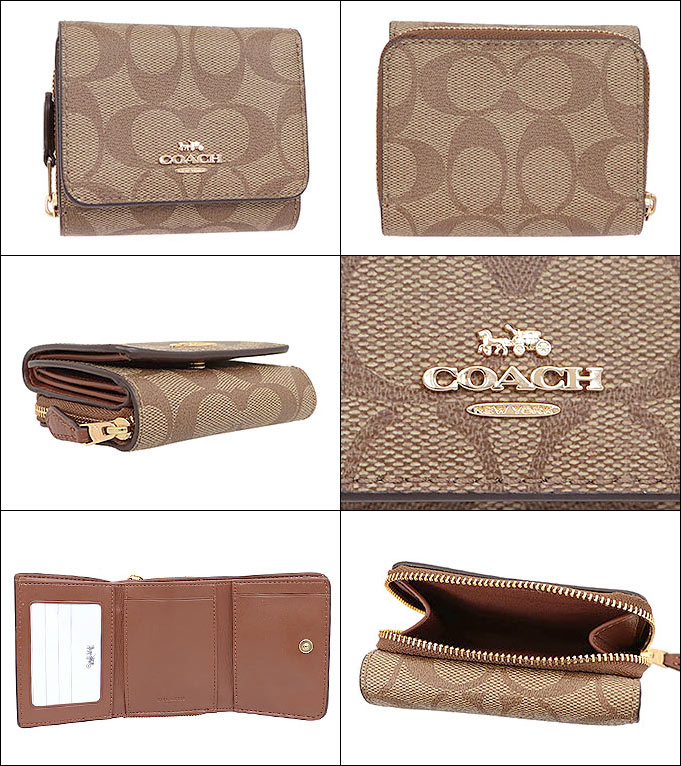 ●【コーチ COACH】 ラグジュアリー シグネチャー スモール トライフォールド ウォレット 名称SIG SM TRFD WLT 種類 小物/財布/三つ折り財布 サイズ 横幅:10cm 高さ:8cm マチ:3cm 重さ:100g 仕様本体:ホックボタン開閉 背面:ファスナー式マチ付小銭入れ×1 内部:札入れ×1 カード×2 ポケット×1 パスケース×1 素材PVCコーティングキャンバス×レザー カラー カーキ×サドル2 IME74 【金具の色】ライトゴールド 型番 F41302 付属品 なし 【2018 秋冬 新作】 コーチ COACHの財布(三つ折り財布)です。